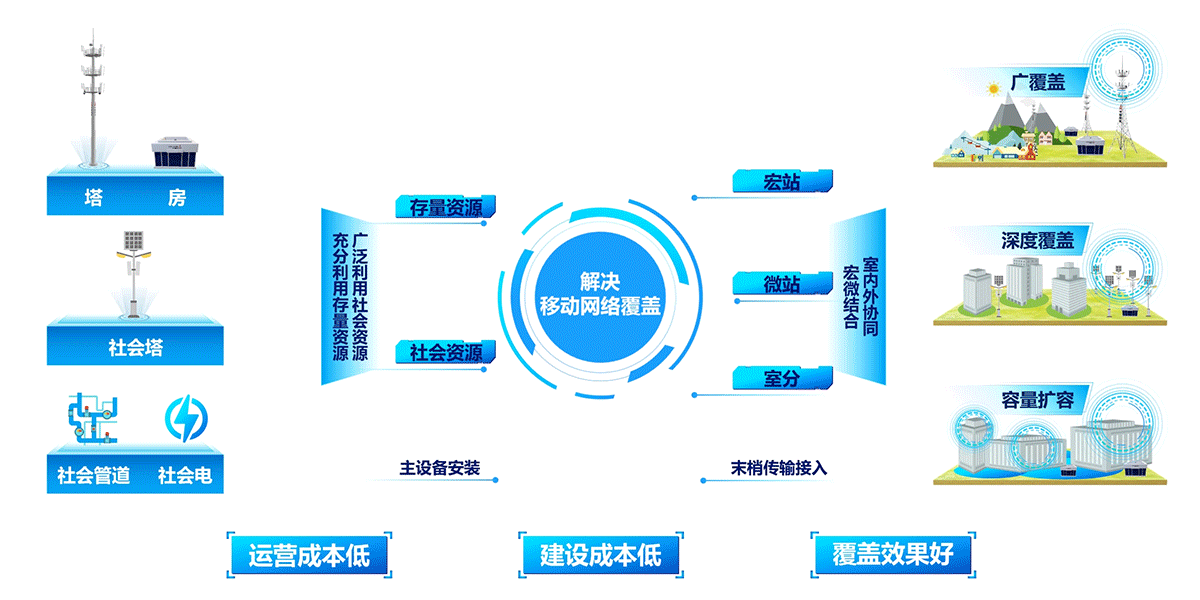 為解決居民區(qū)、商務(wù)區(qū)、景區(qū)、園區(qū)、校園等樓宇群移動網(wǎng)絡(luò)流量大、覆蓋難、對鐵塔美化要求高等特殊場景移動通信網(wǎng)絡(luò)覆蓋問題,通過充分共享已有資源及社會桿塔、管道、電力等資源,宏微結(jié)合、室內(nèi)外結(jié)合,為通信運營商提供掛載、接入傳輸、電源配套等一體化服務(wù),低成本、高效率解決網(wǎng)絡(luò)覆蓋。